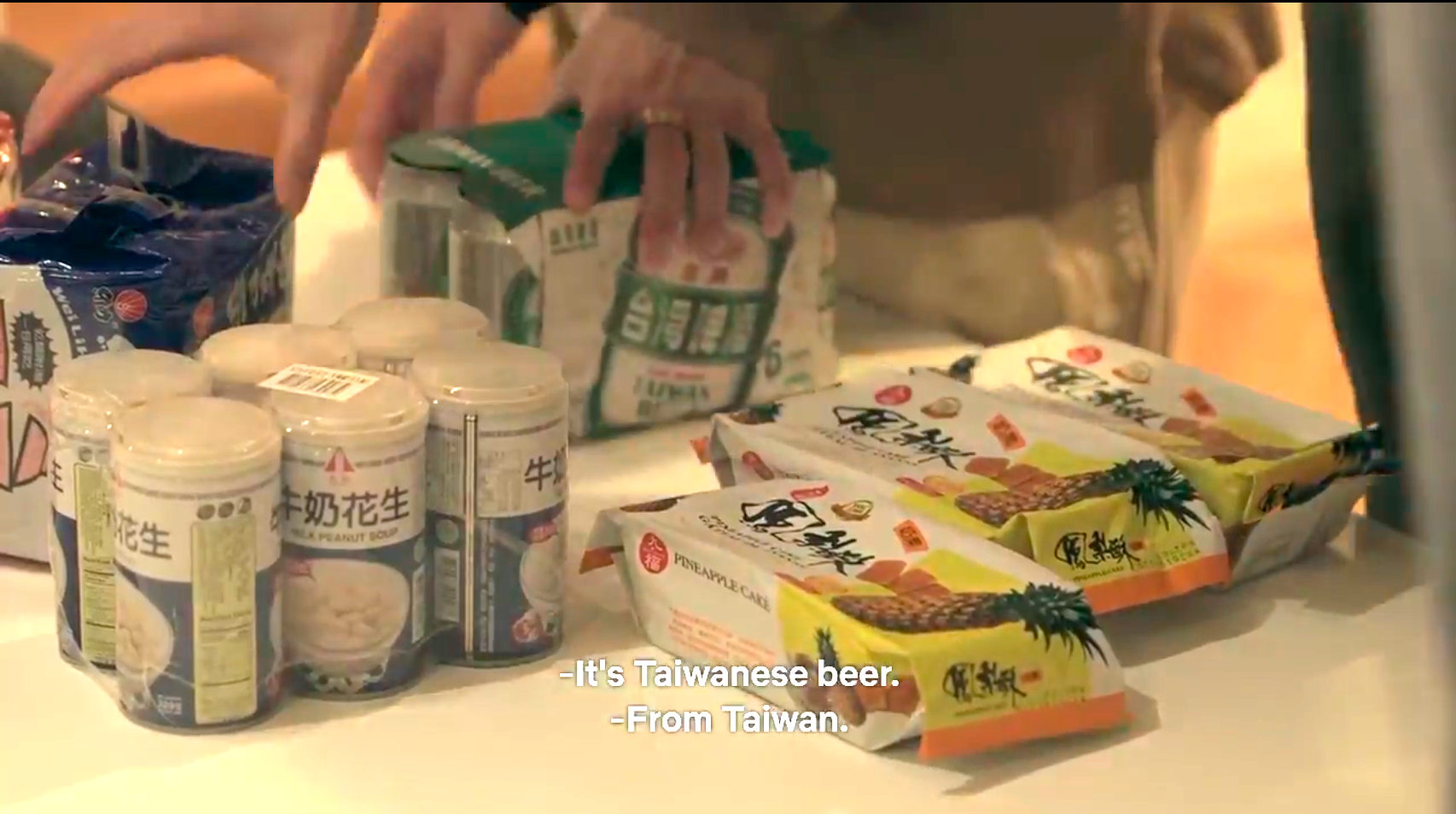 Shohei brought souvenir snacks from Taiwan, including pineapple cakes, milk peanut soup and Taiwan Beer. The subtitles are great. They later have the beer with dinner and everyone remarks about the beer’s unique flavour.